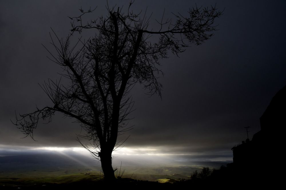 Di impatto visivo, questa fotografia coglie, al riparo di un grande albero, un momento molto particolare di un tramonto. La grande pianta in controluce appare in primo piano. La sua figura si staglia come una silhouette nera e possente, sullo sfondo di un paesaggio tenebroso e cupo. All'orizzonte si scorge solo un raggio di luce che filtra da nuvole dense di pioggia, illuminando il fondo della vallata. L'atmosfera che l'immagine comunica è di grande suggestione, grazie alla capacità interpretativa dell'autore e alla sua forza.